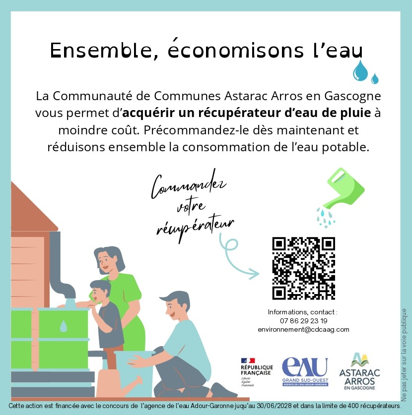 Grâce au concours de l’Agence de l’Eau Adour-Garonne, les habitants peuvent s’équiper d’un récupérateur d’eau de pluie à prix réduit.
