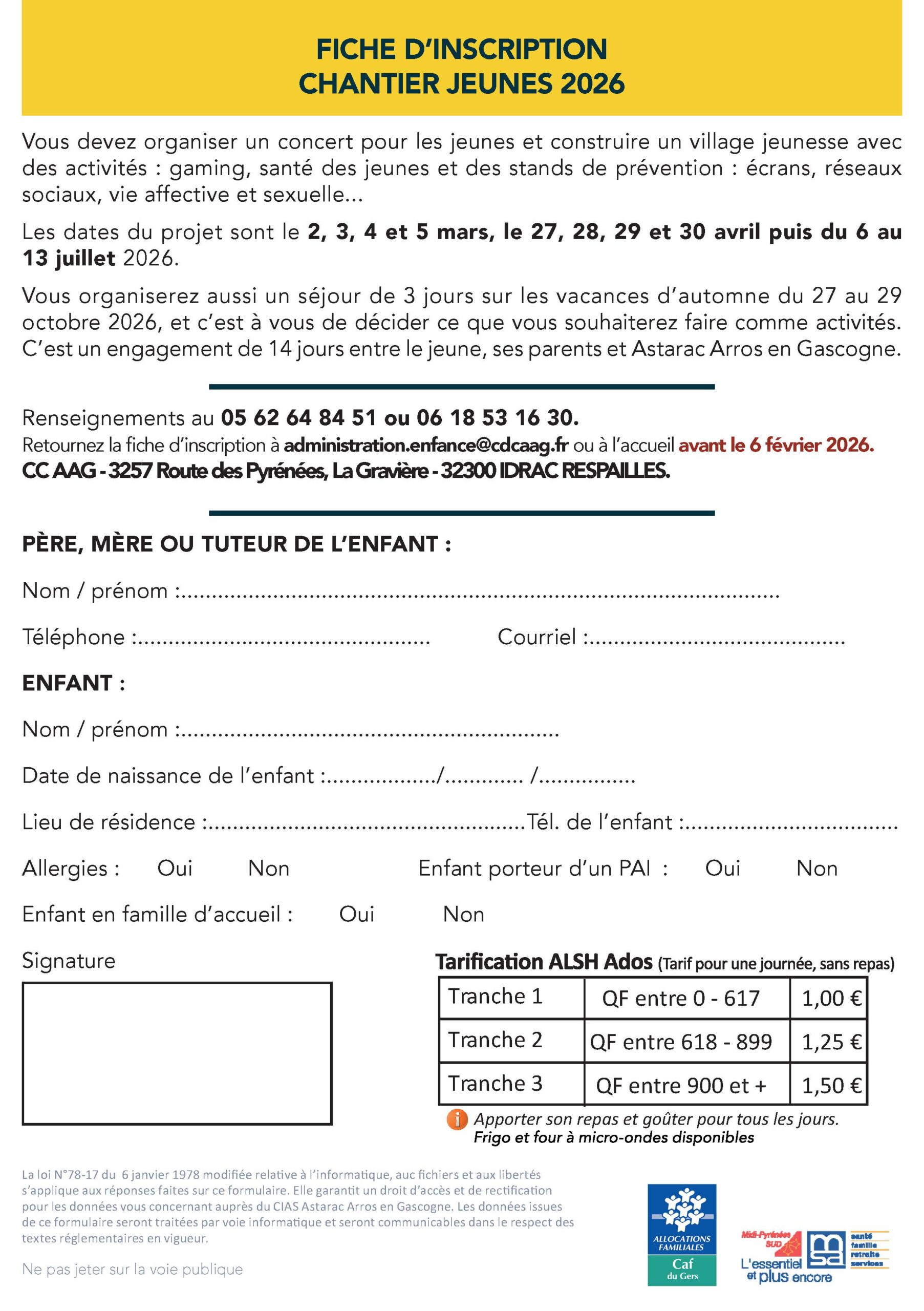 Les inscriptions du chantier jeunes sont ouvertes, cette année le projet consiste à organiser un concert pour les jeunes et construire un village jeunesse avec des acticités : gaming, santé des jeunes et des stands de prévention : écrans, réseaux sociaux, vie affective….