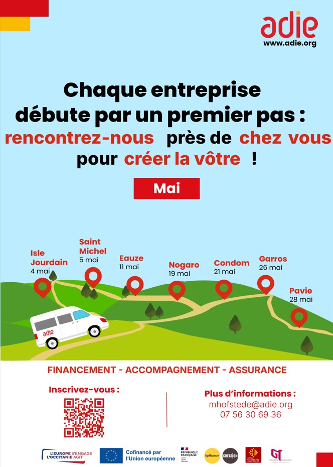 En mai 2026, l’unité mobile de l’Adie Occitanie sillonne le département pour aller à la rencontre de celles et ceux qui souhaitent créer ou développer leur entreprise.