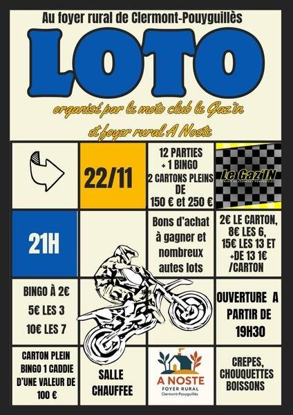 Le Moto club le Gaz’in et le foyer rural A Noste vous propose une soirée loto au foyer rural de Clermont-Pouyguillès.