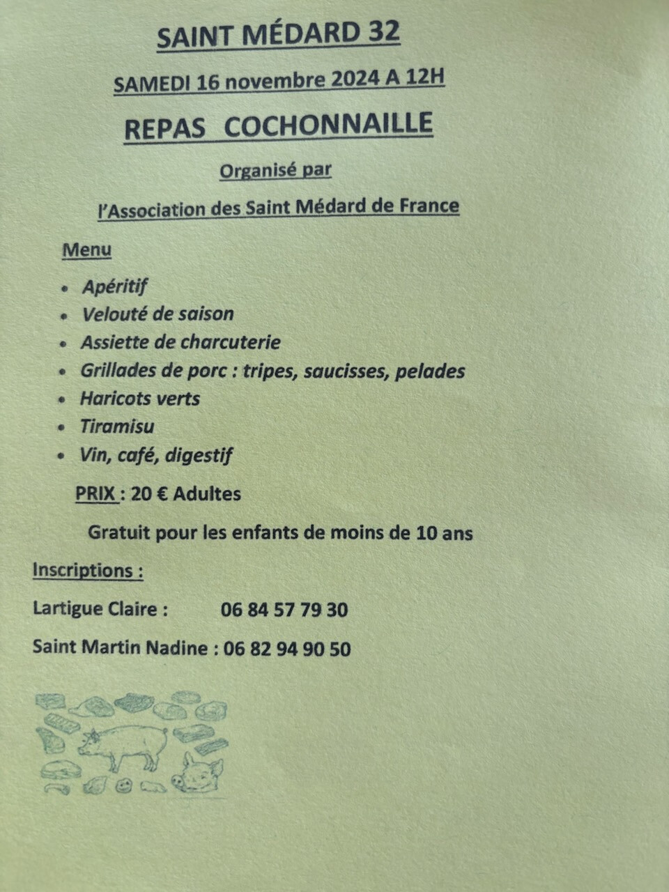 En collaboration avec l’association des Saint Médard de France, rendez-vous à partir de 12h pour un moment gourmand et convivial autour d’un repas cochonnaille