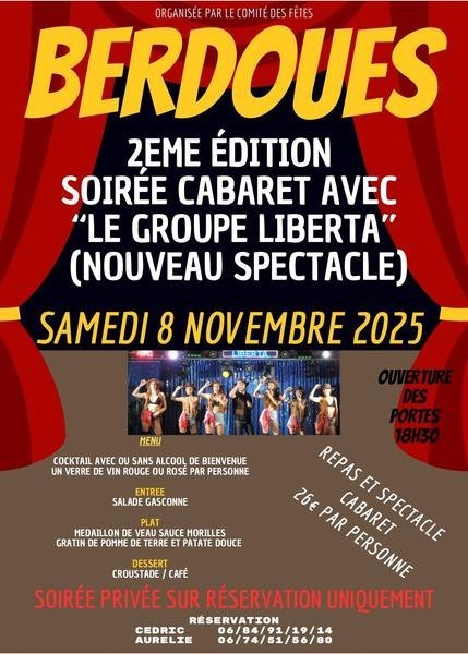 Pour la 2e année consécutive, le comité des fêtes de Berdoues vous attend nombreux pour une soirée cabaret avec « le groupe Liverta » !