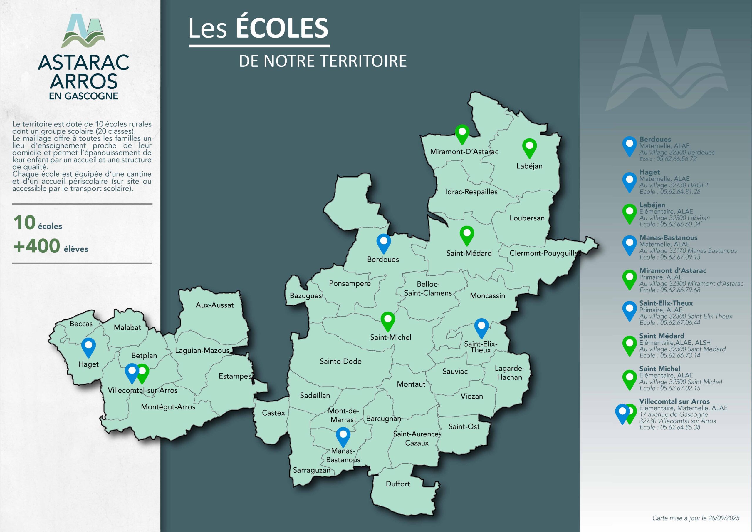 Le territoire est doté de 8 écoles rurales et d’un groupe scolaire (20 classes). Le maillage offre à toutes les familles un lieu d’enseignement proche de leur domicile et permet l’épanouissement de leur enfant par un accueil et une structure de qualité. Chaque école est équipée d’une cantine et d’un accueil périscolaire (sur site ou accessible par le transport scolaire).
